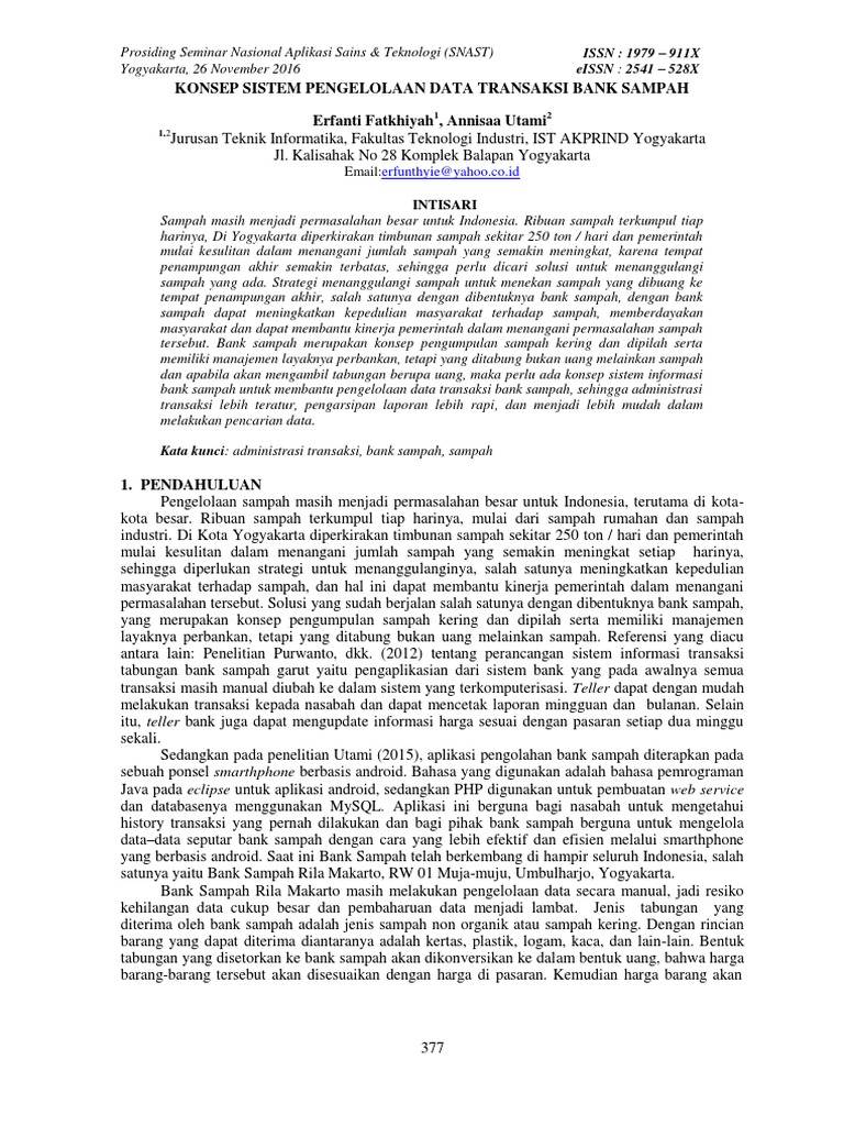 In the process of making system do the research in bank sampah asri raharjo pati distric, pati regency. Karya ilmiah mahasiswa manajemen informatika 1 aplikasi bank sampah unit margodadi lampung berbasis web aurilia vica kusuma1, dedy indra setiawan2, erwan saputra3 eko subyantoro4 1 mahasiswa 1 , 2 mahasiswa 2 3 mahasiswa 3, 4 pembimbing abstrak bank sampah unit margodadi lampung yang terletak di pringsewu merupakan tempat pengelolaan Bank sampah berdiri karena adanya pemikiran masyarakat untuk memperbaiki pengelolaan sampah, dengan melakukan inovasi tertentu.